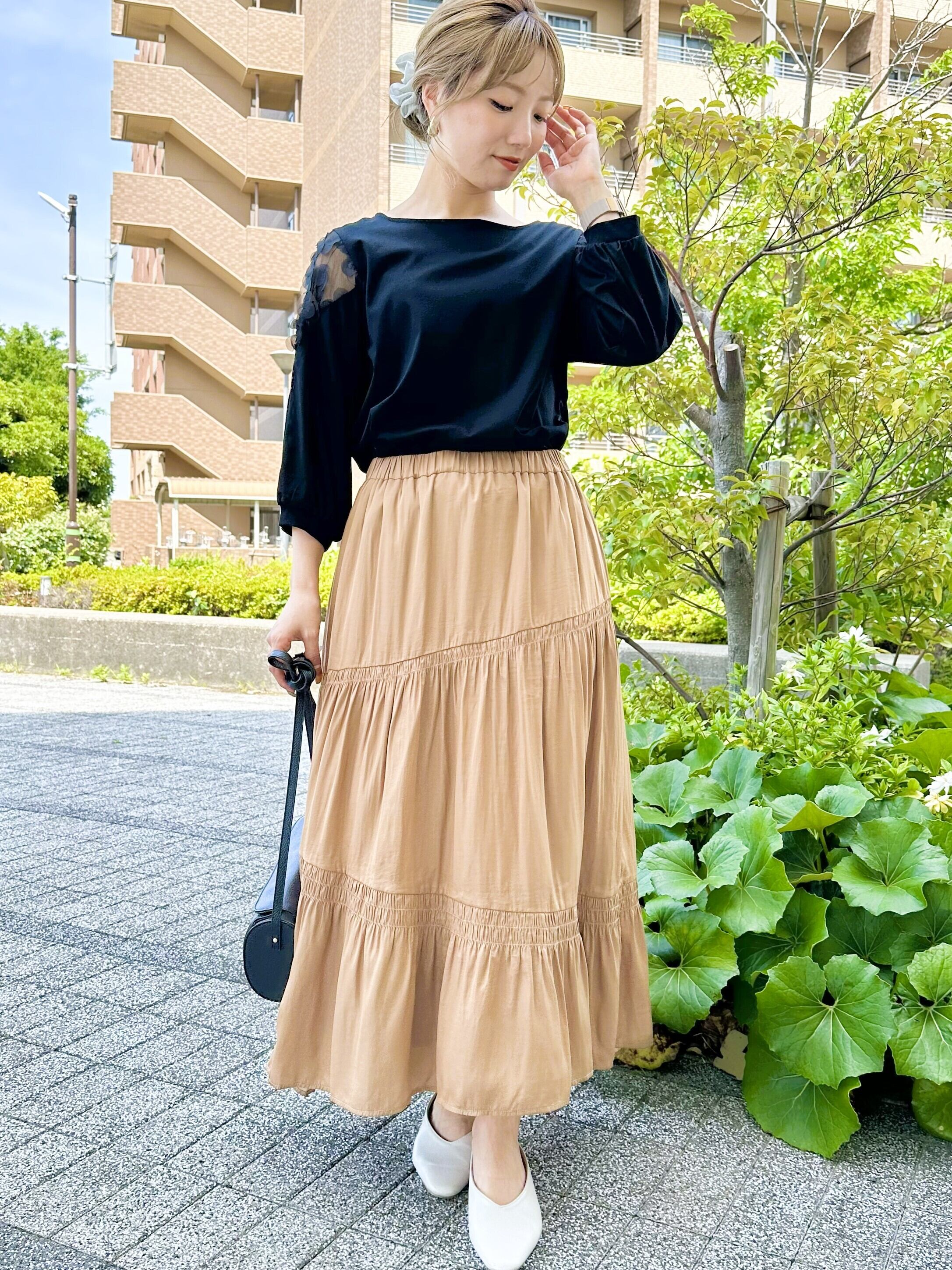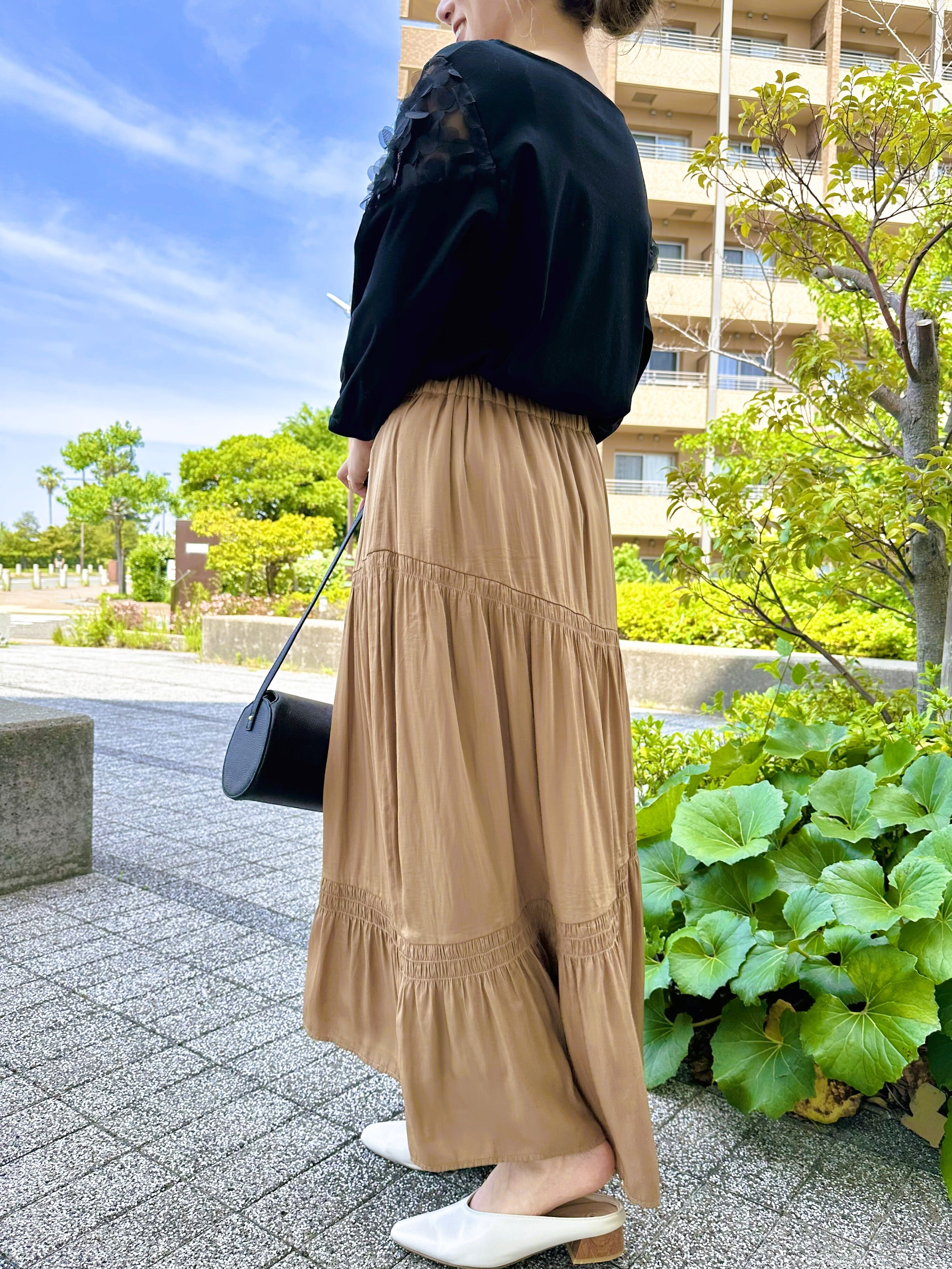 上品な光沢感が魅力のスカート。