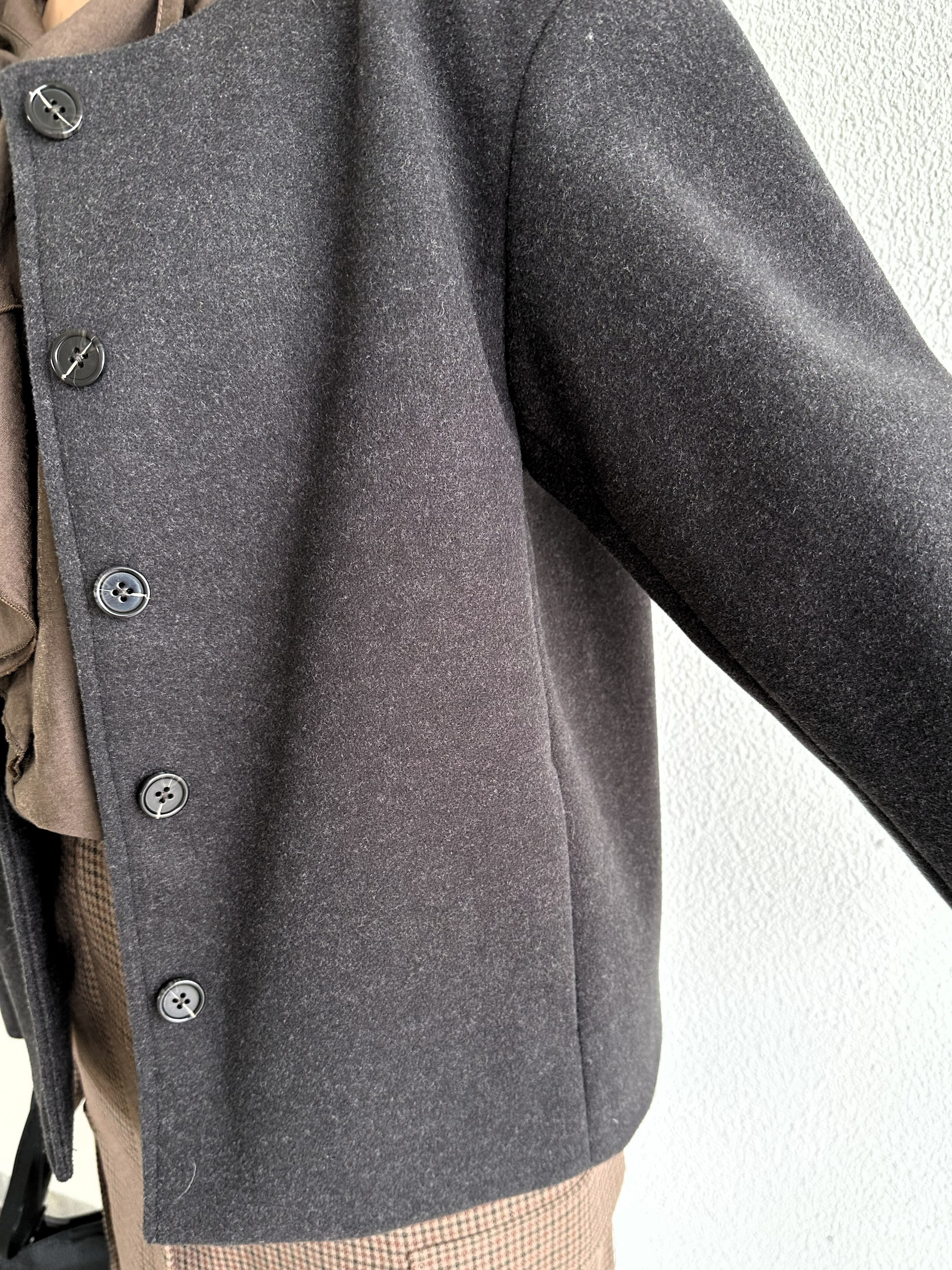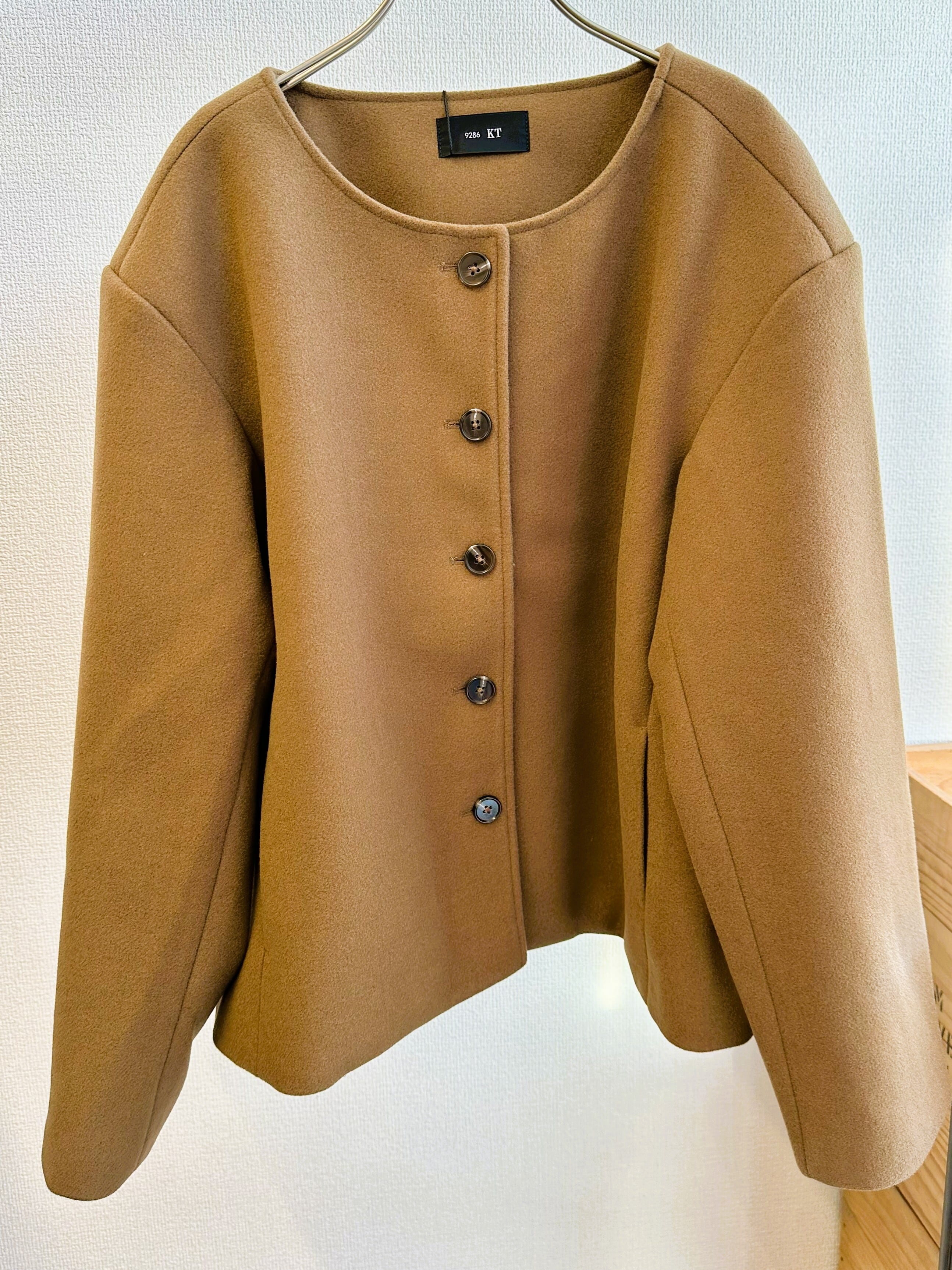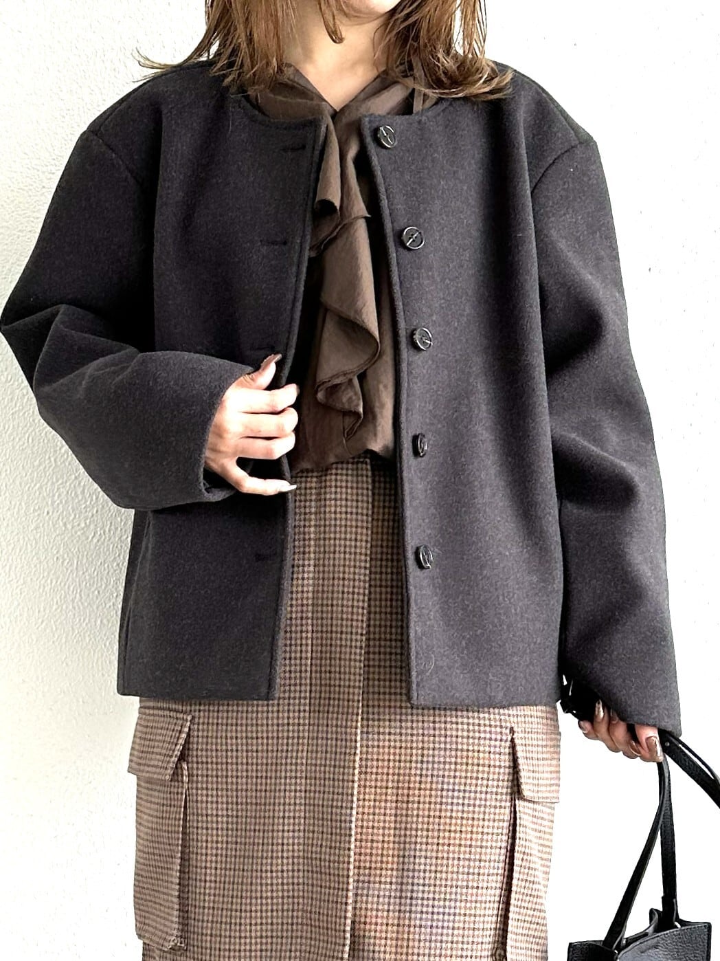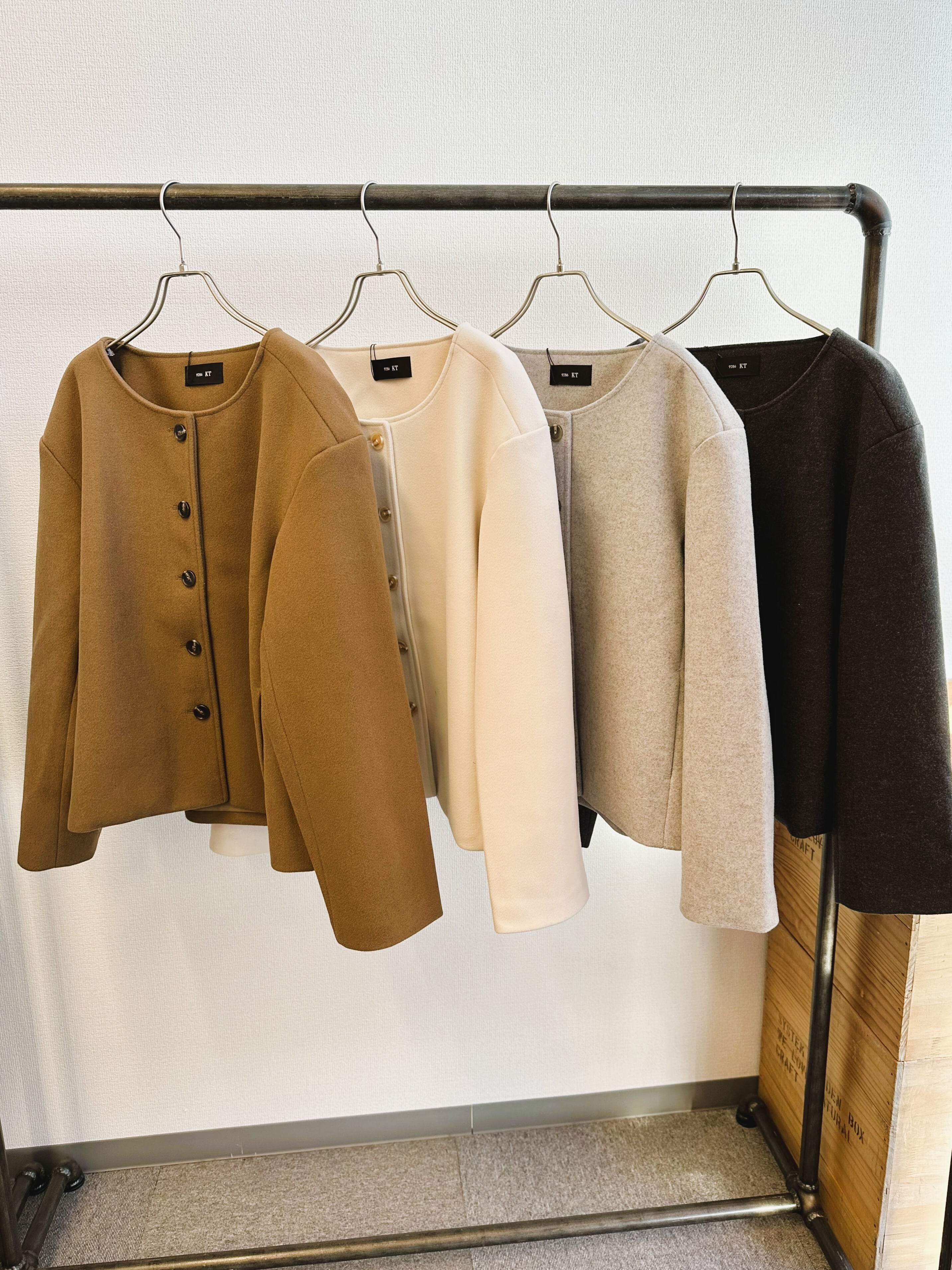 デイリーに使えるウールライクメルトンノーカラージャケット。