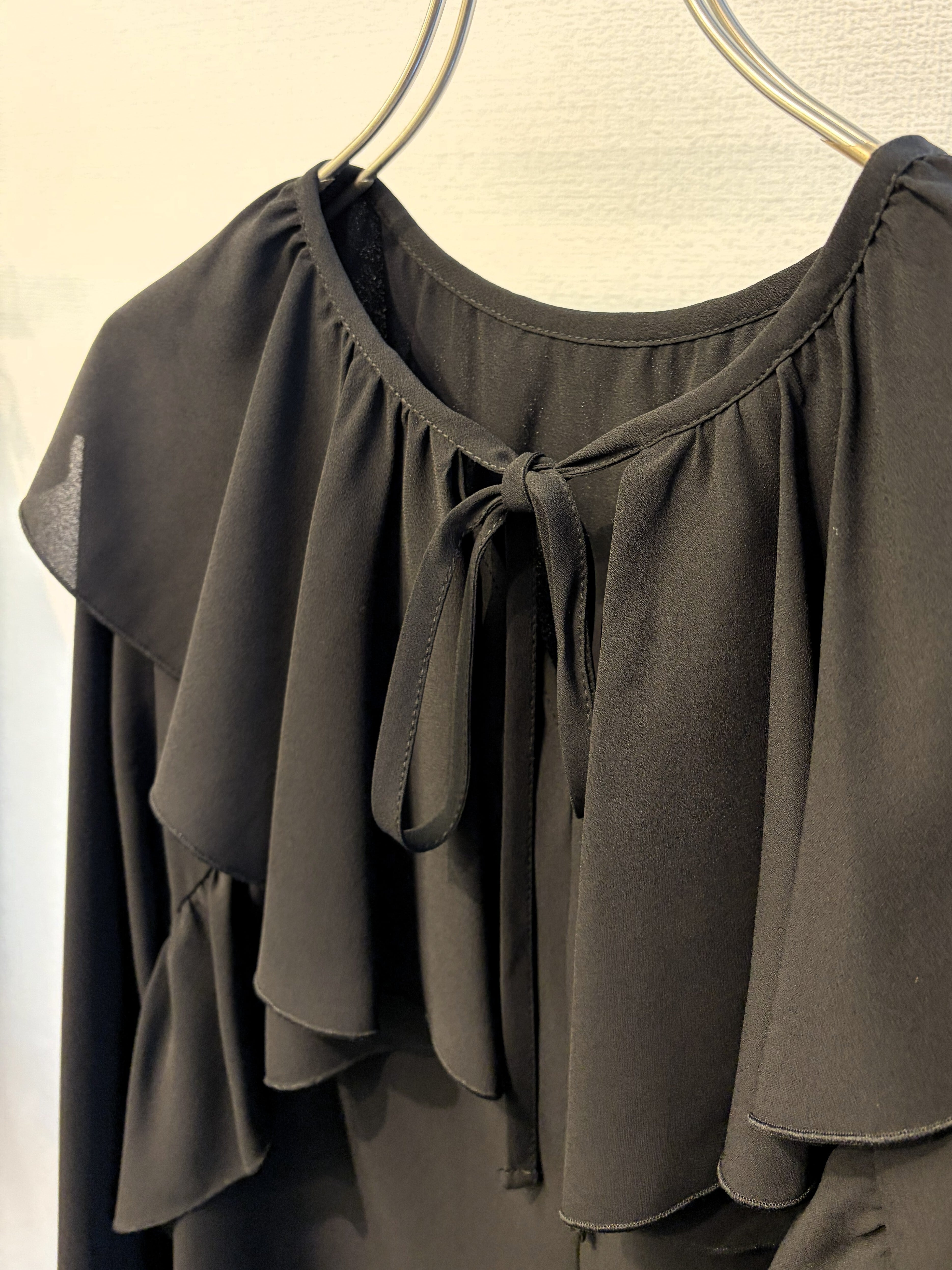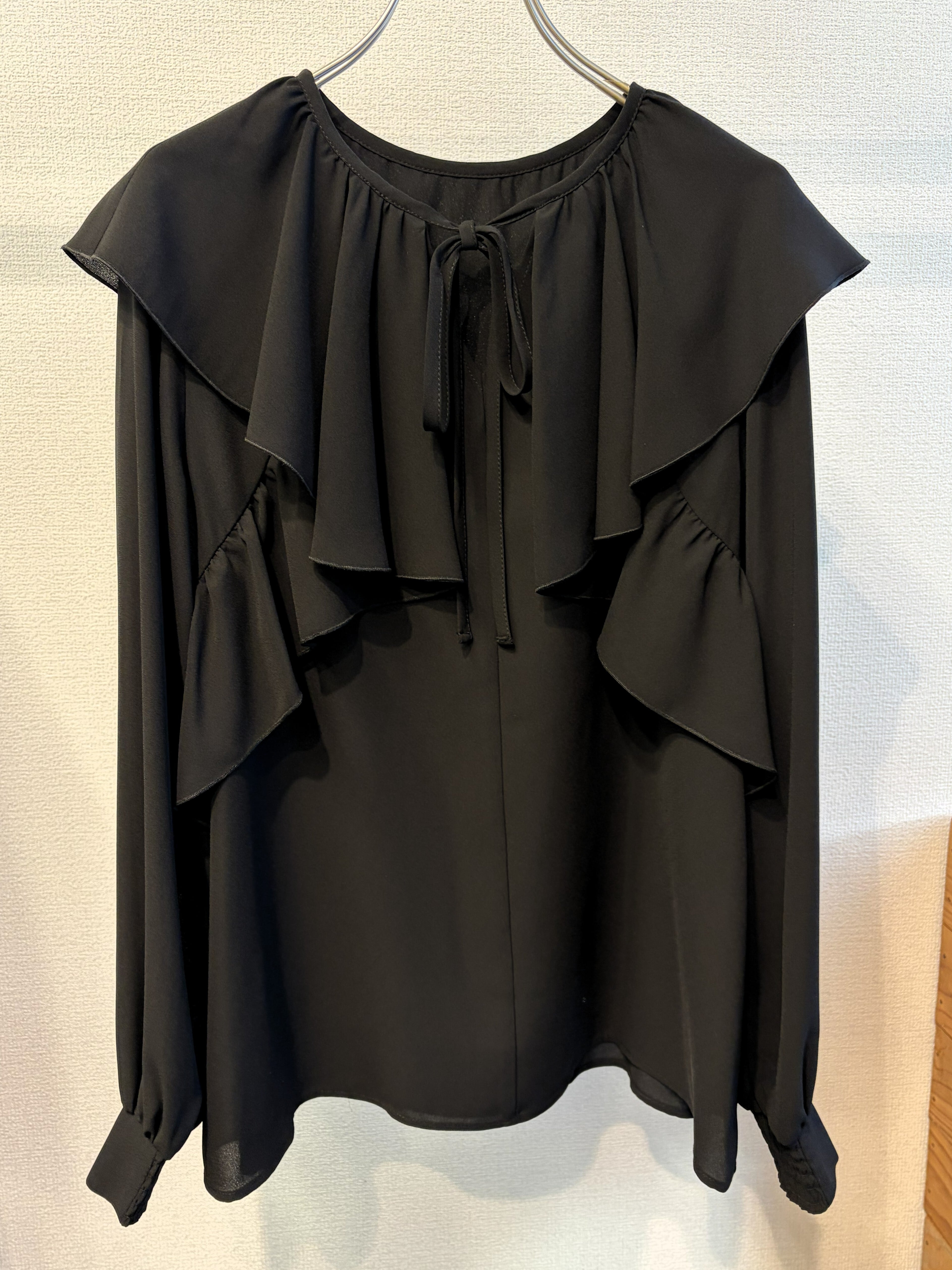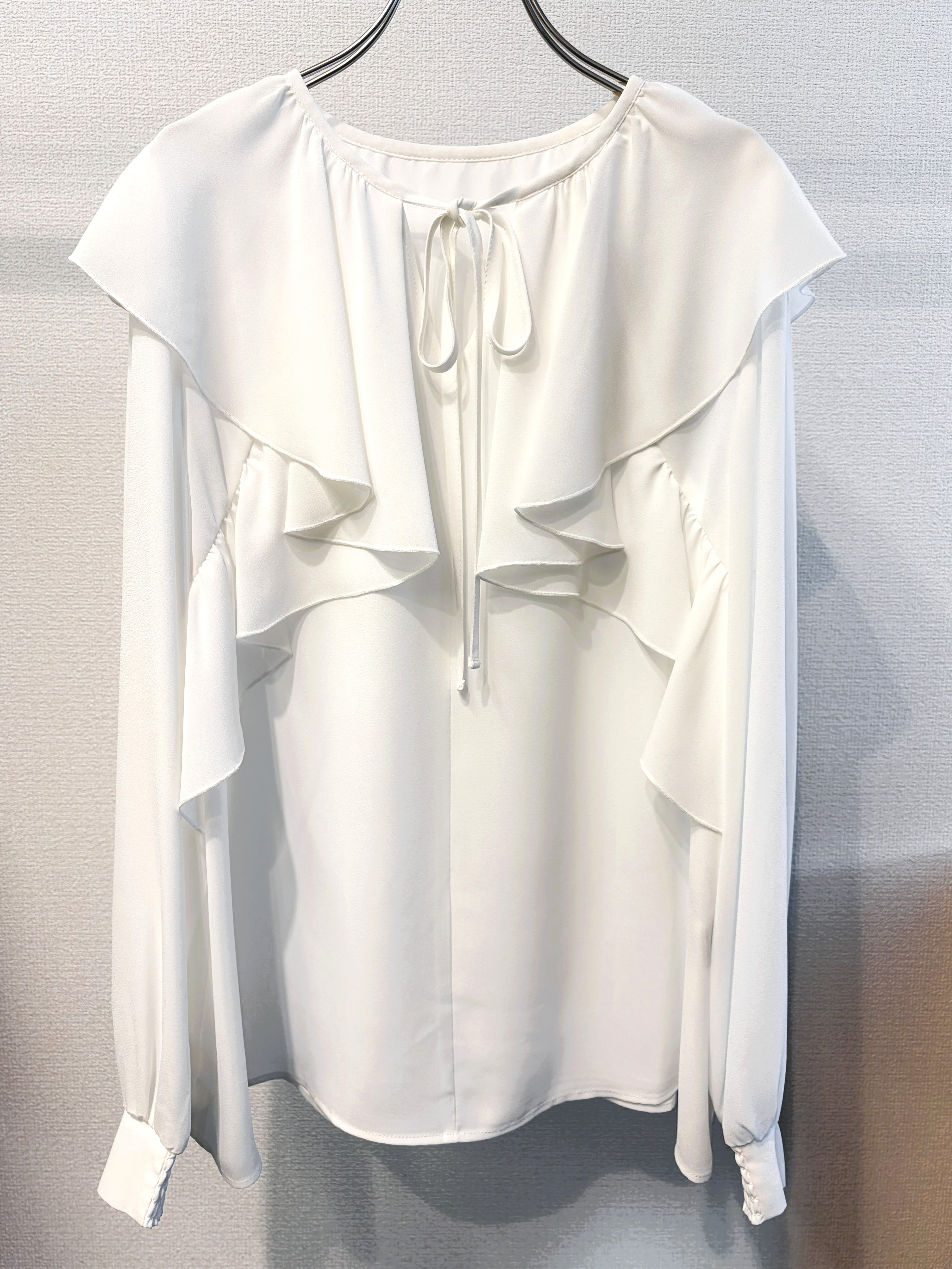 ラッフルカラーがポイントのシフォンブラウス。