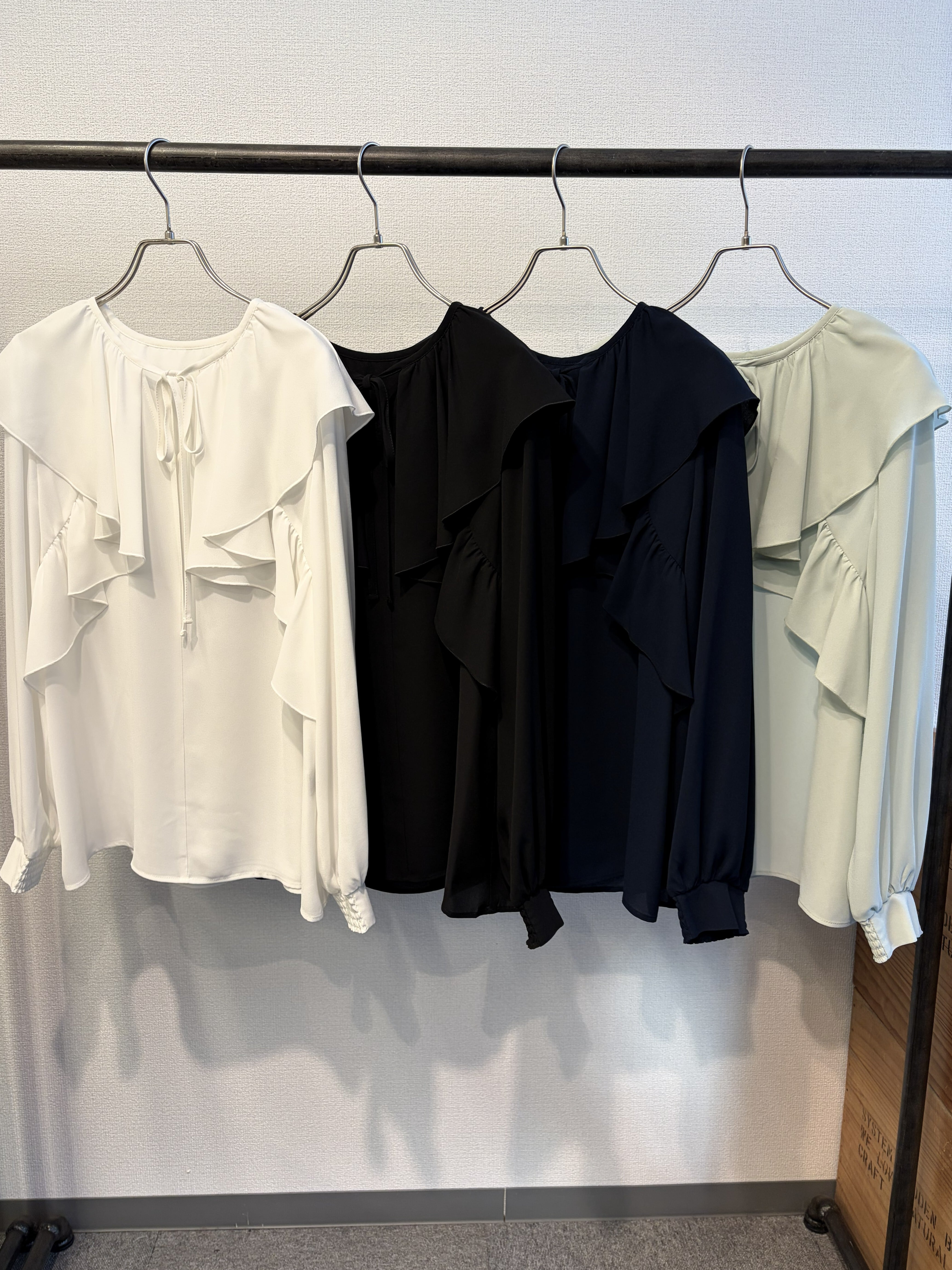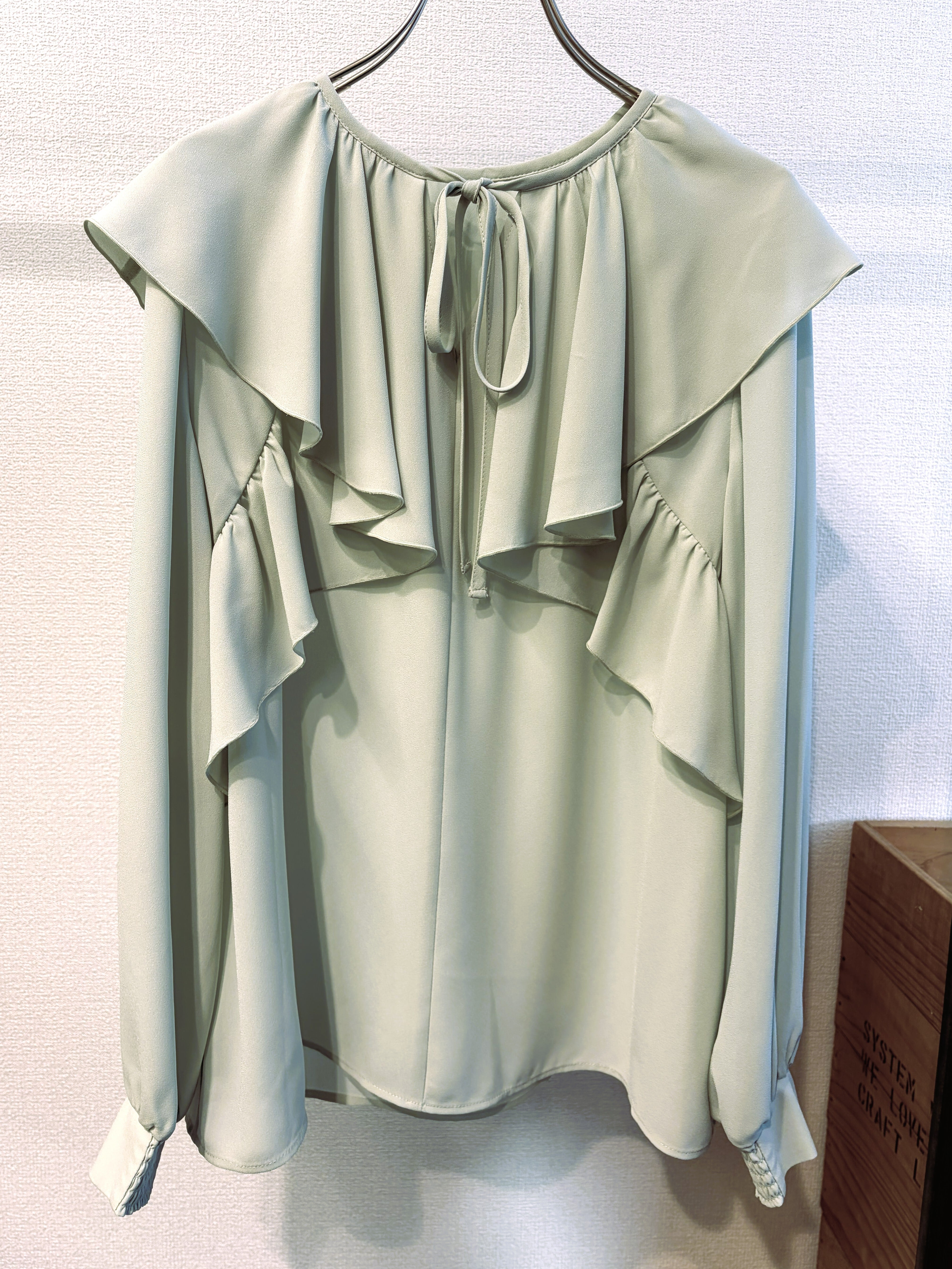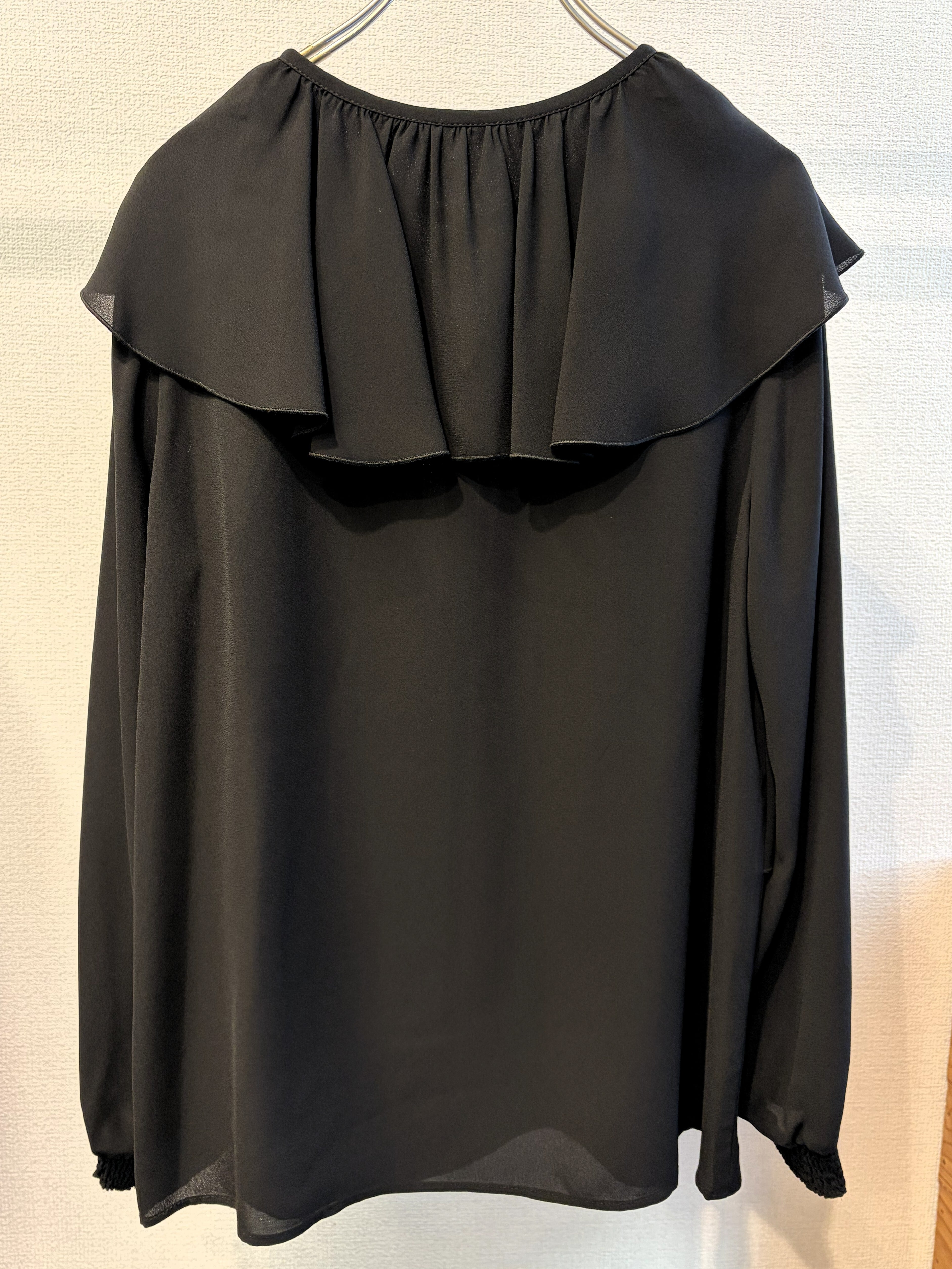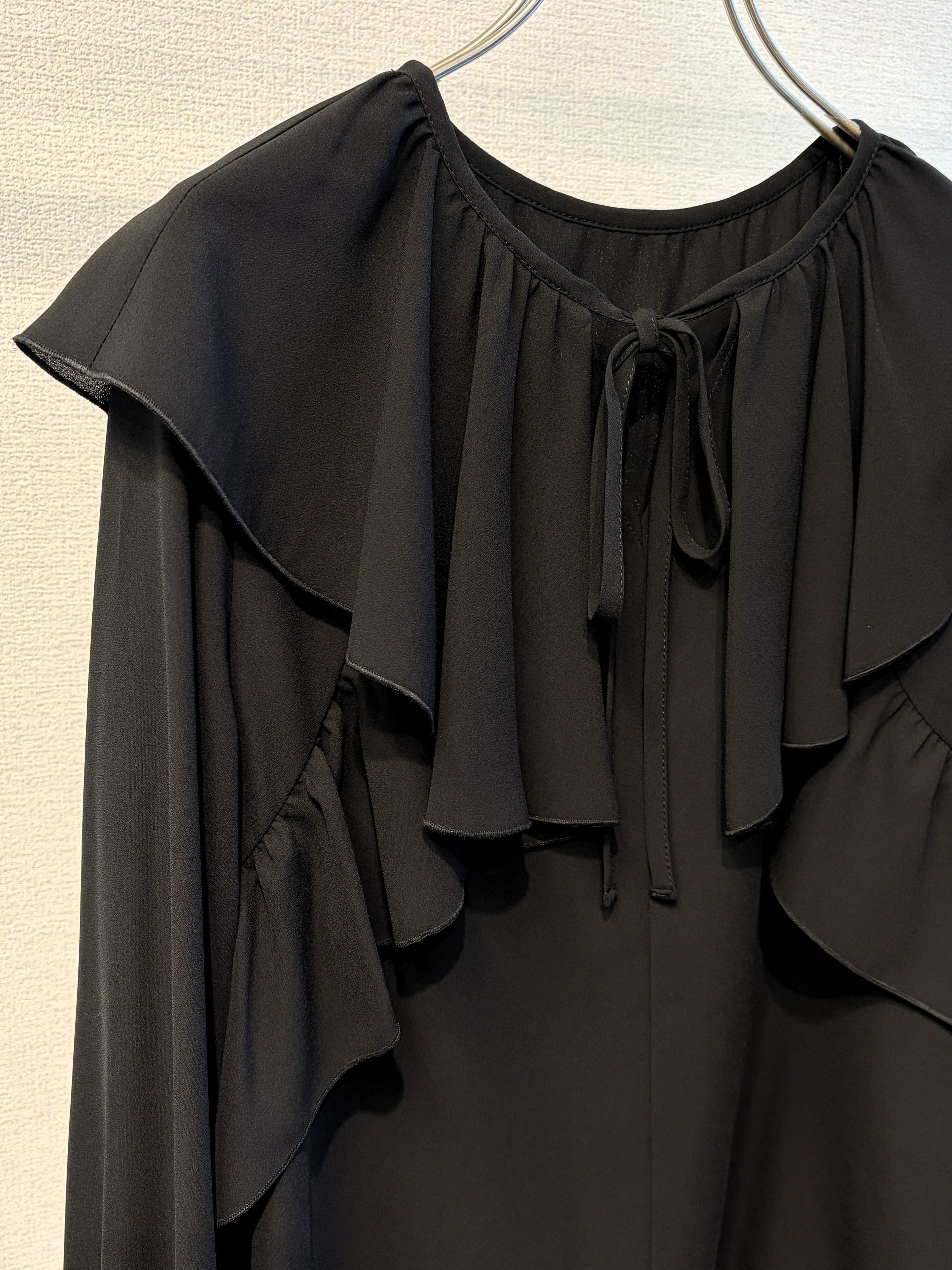 ラッフルカラーがポイントのシフォンブラウス。