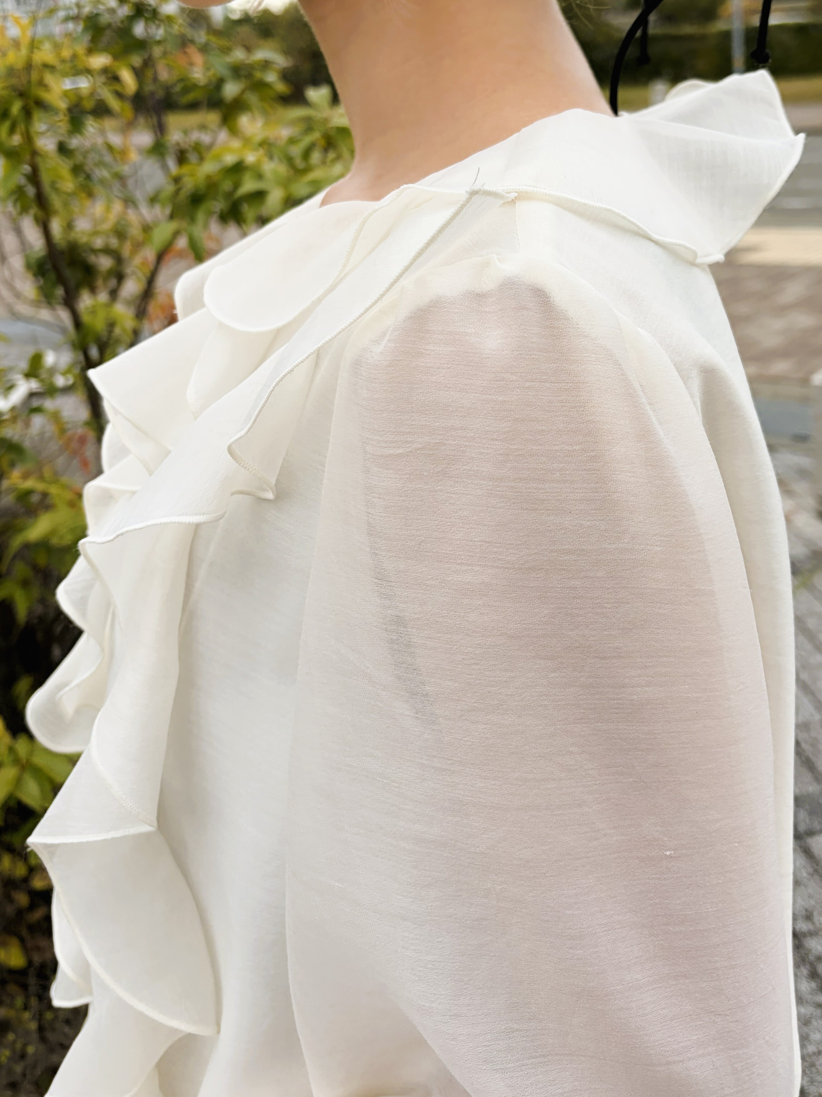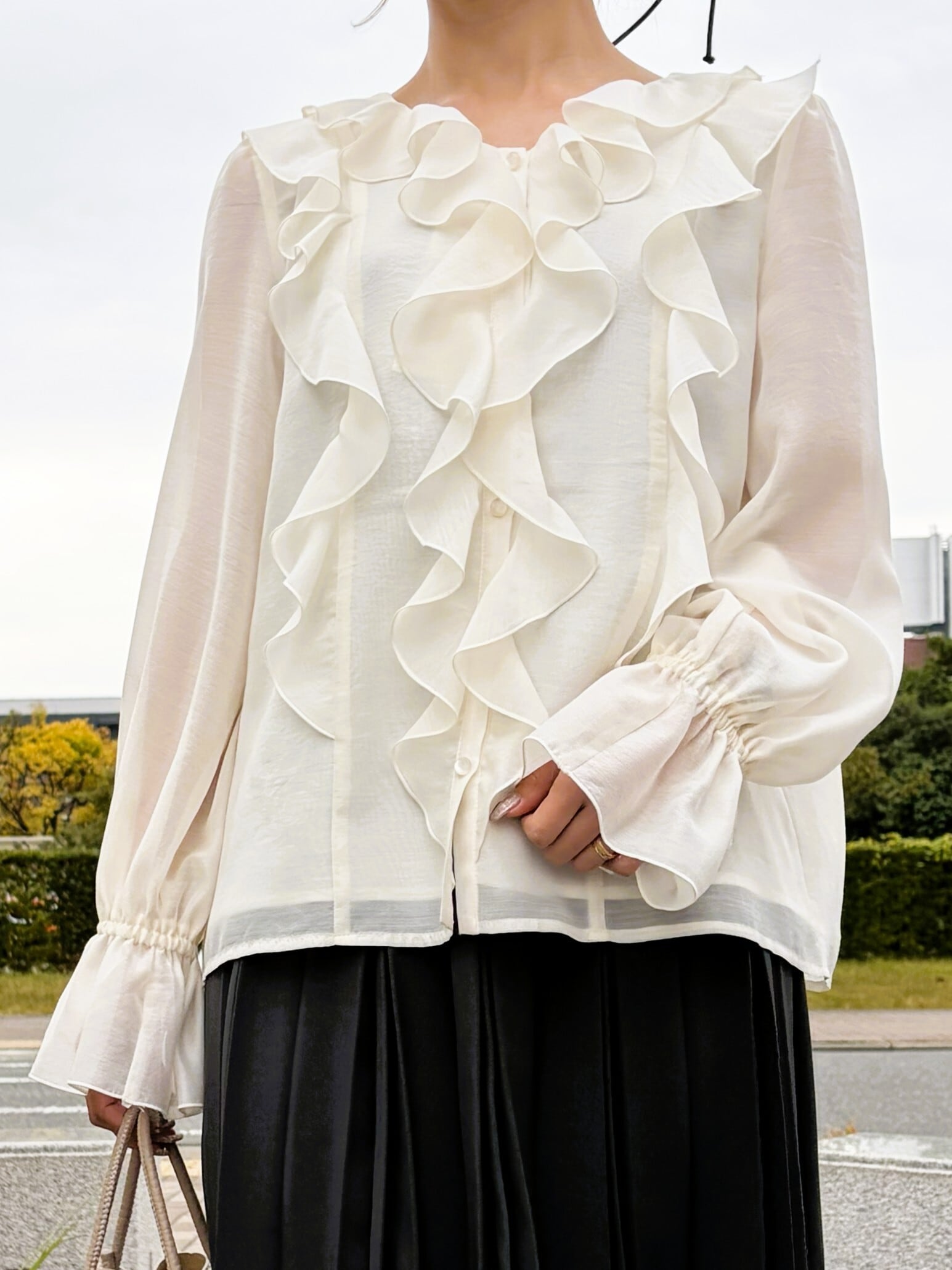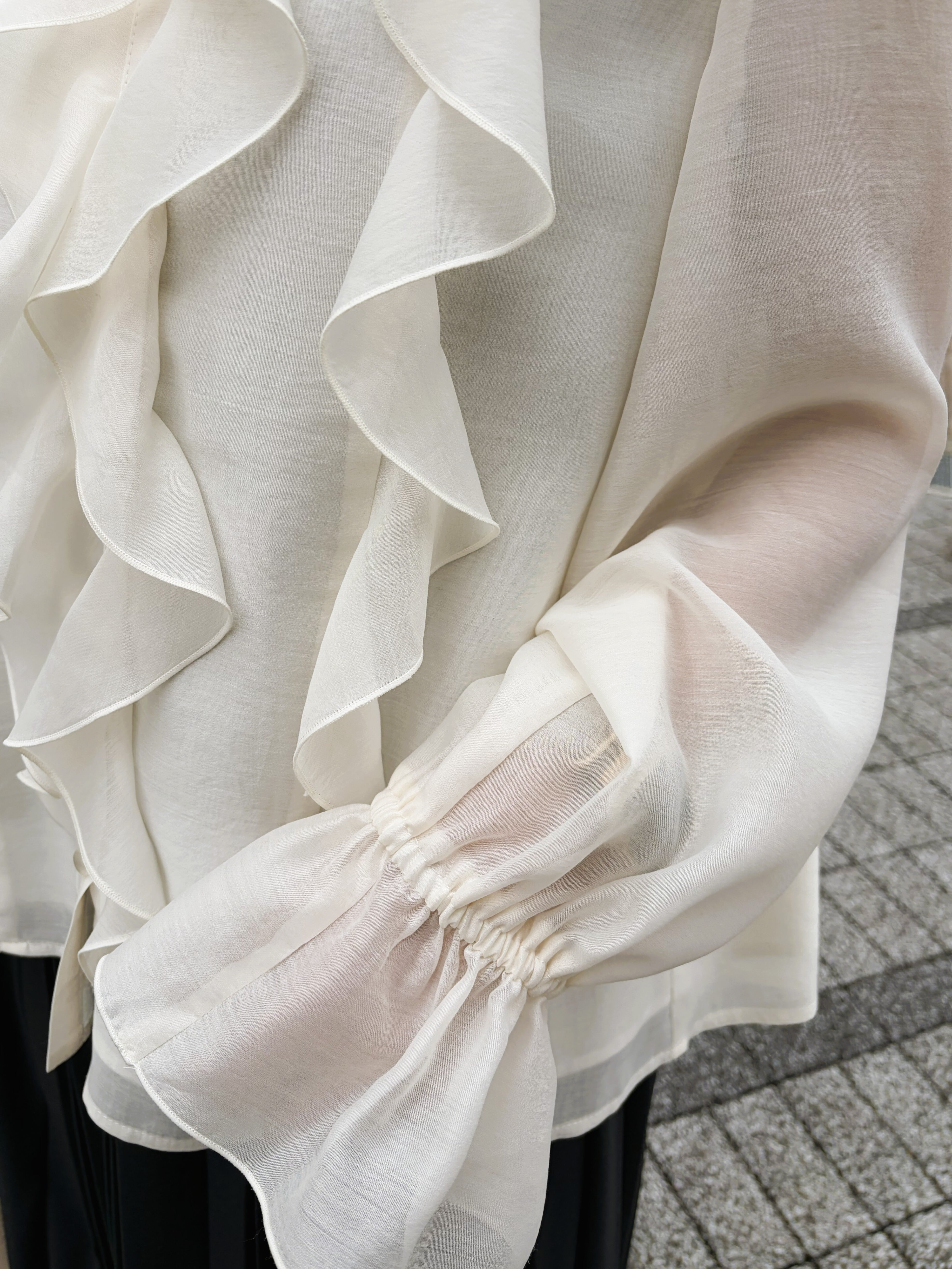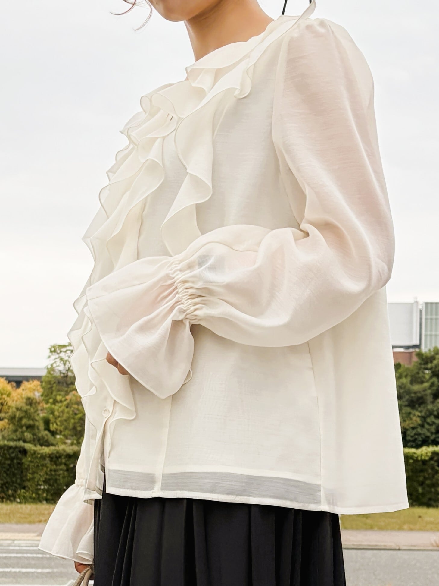華やかな存在感を演出するシアーラッフルブラウス。