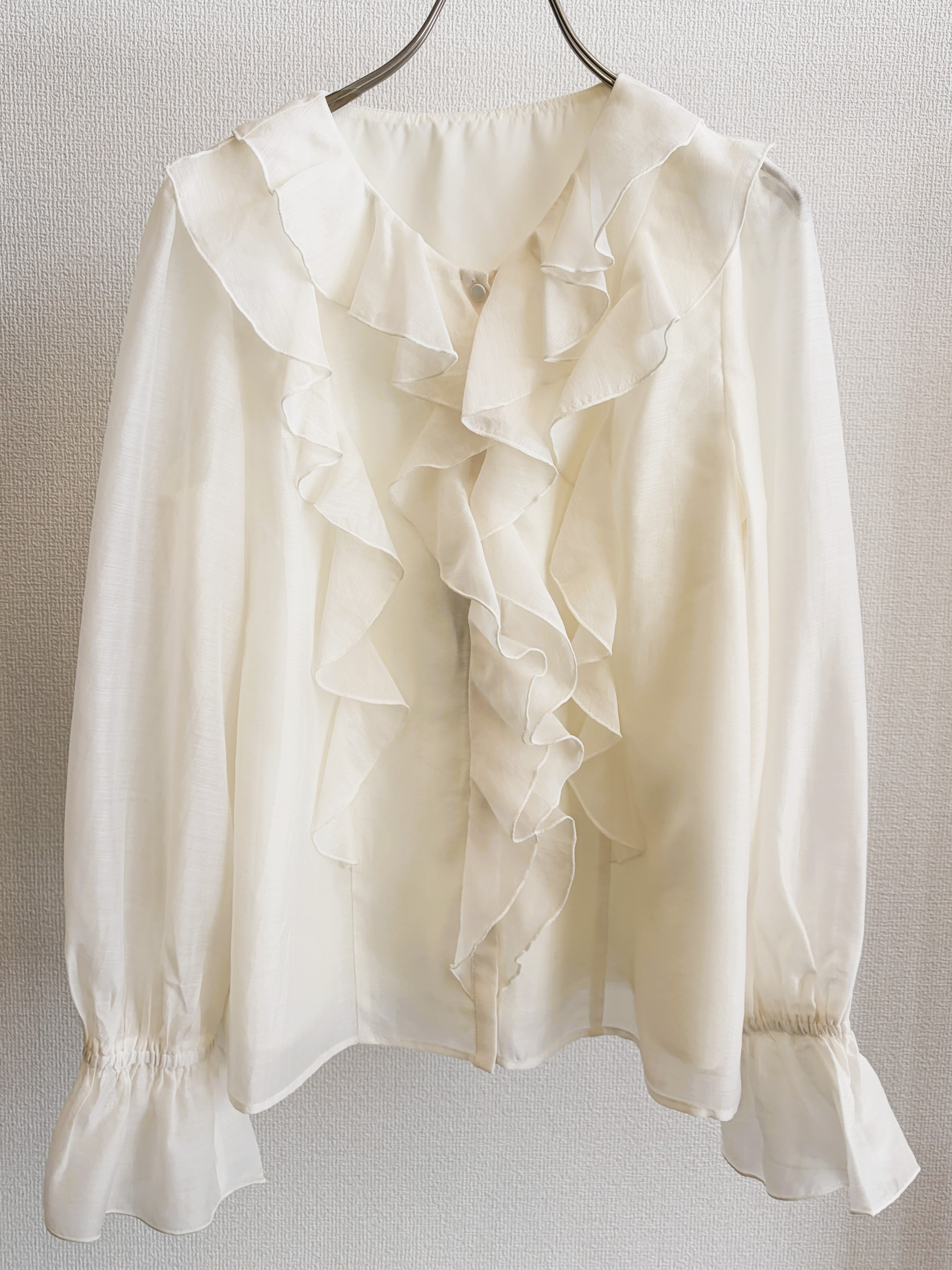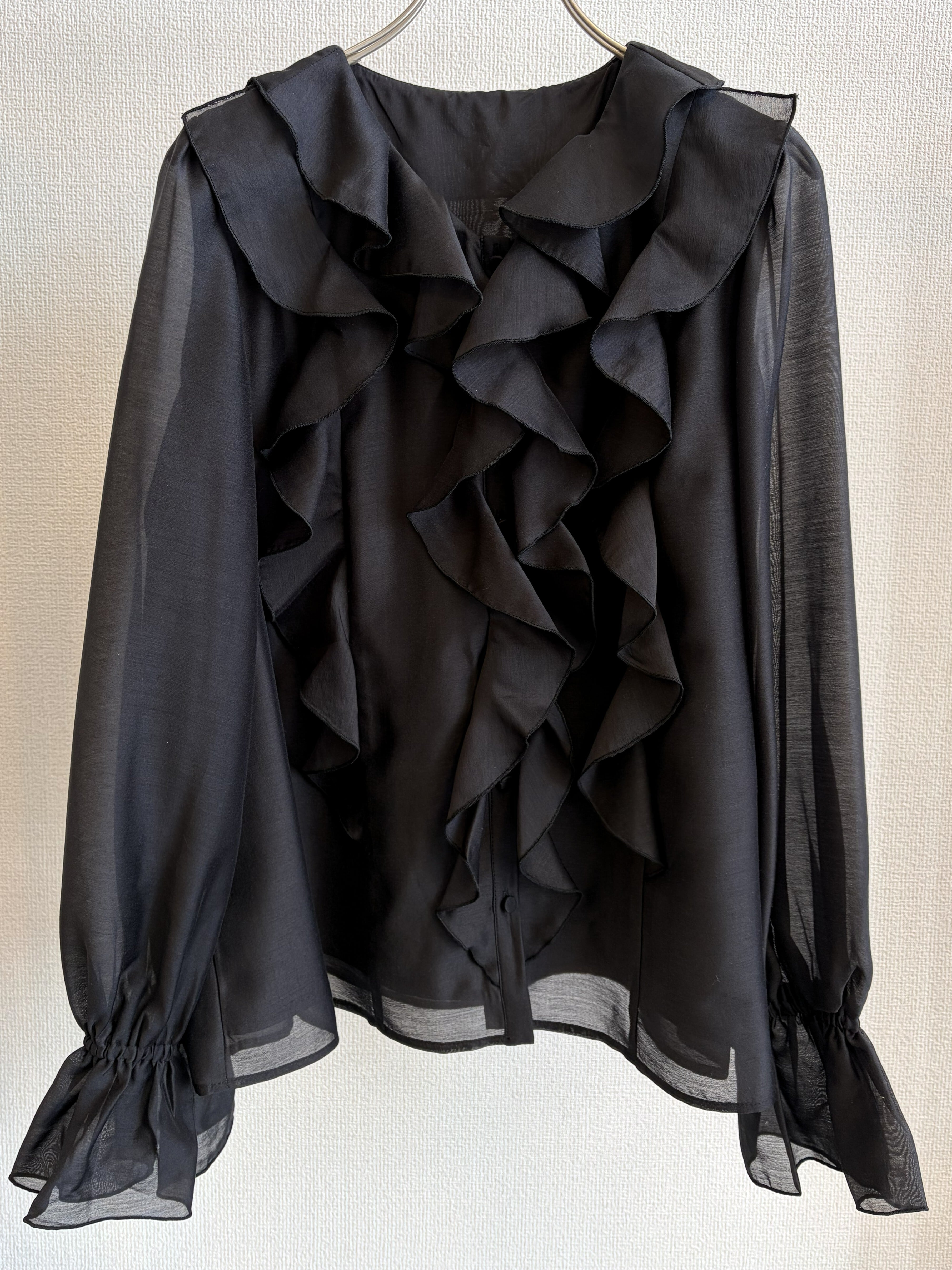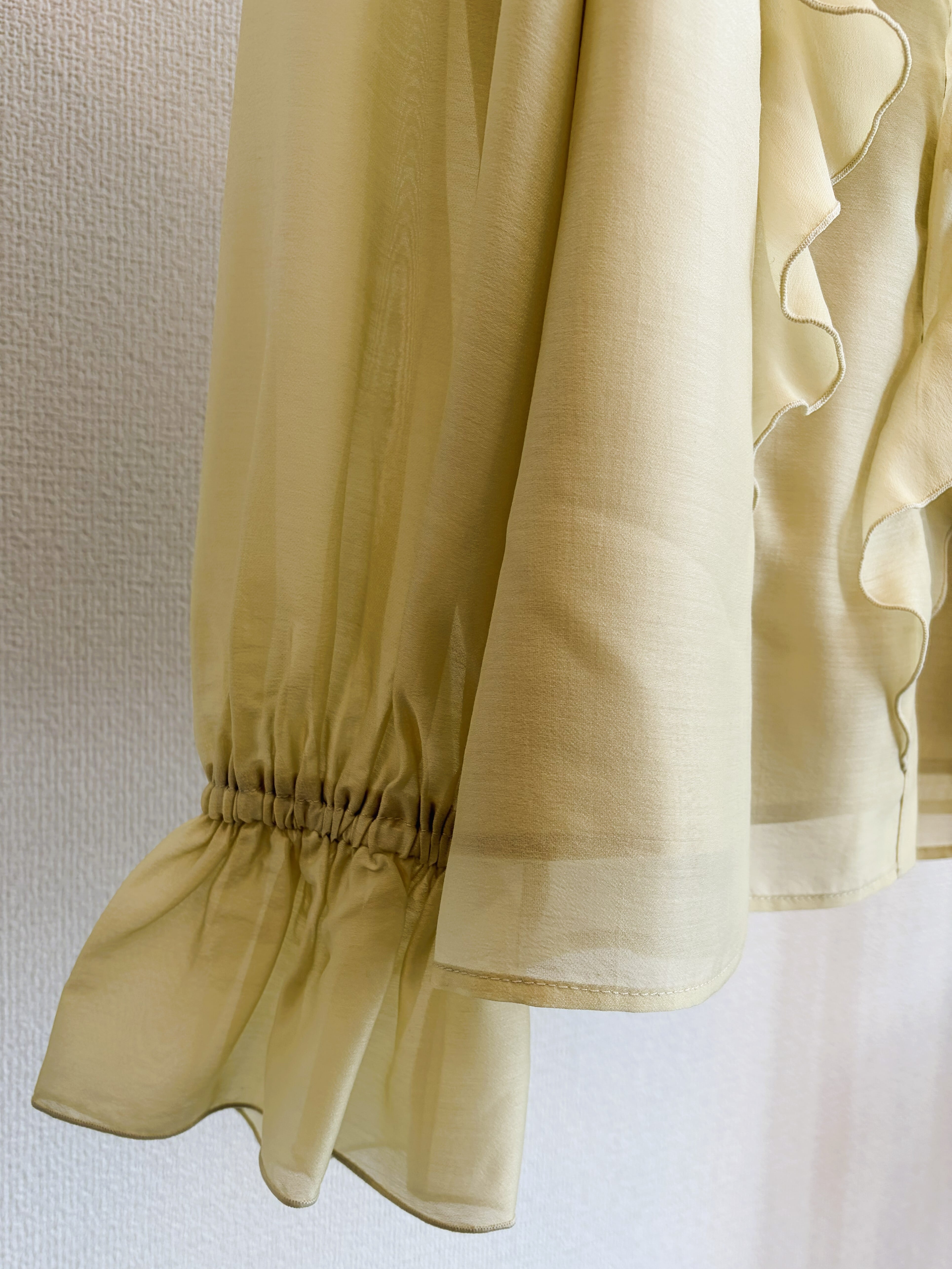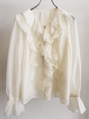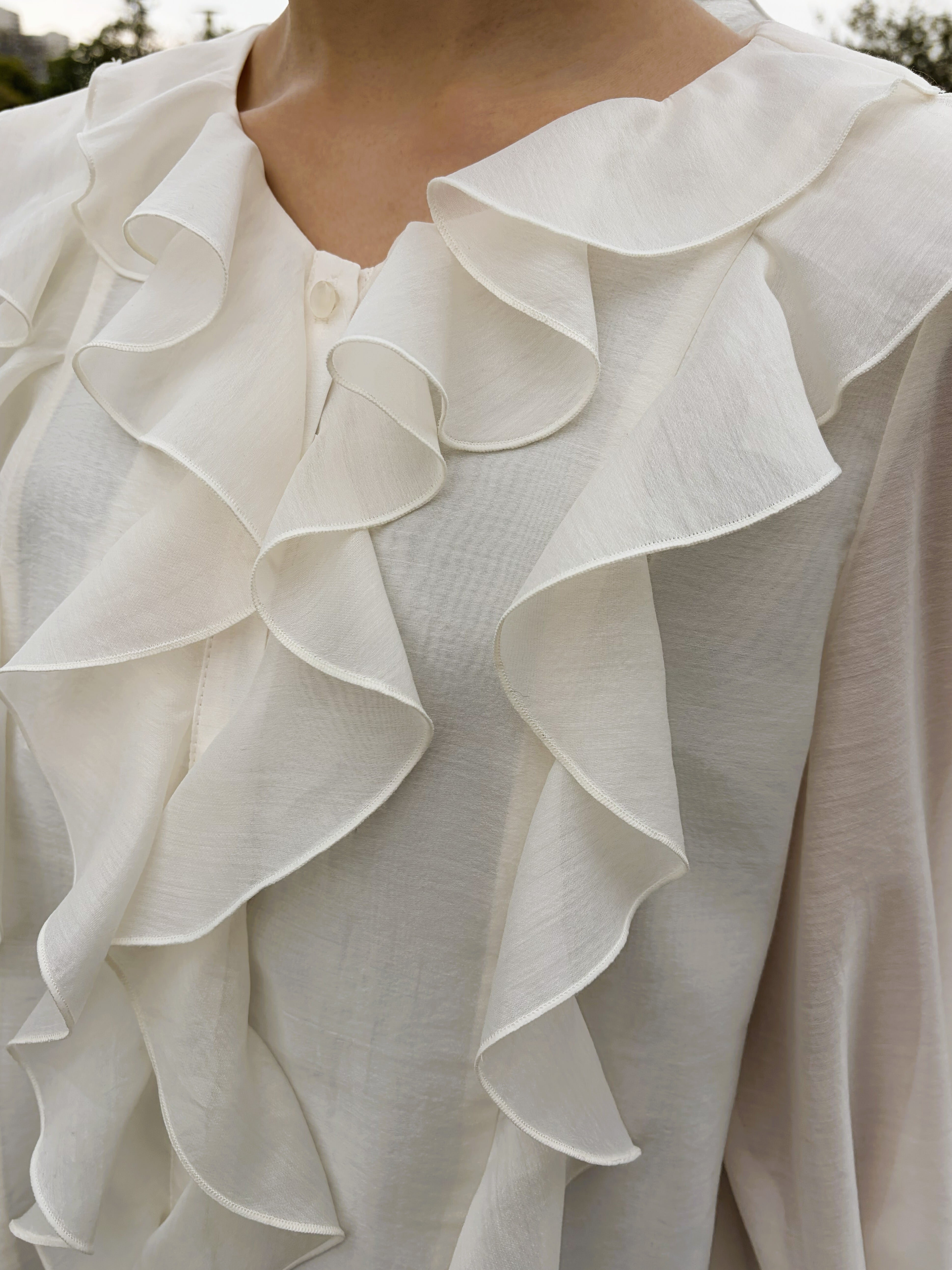 華やかな存在感を演出するシアーラッフルブラウス。
