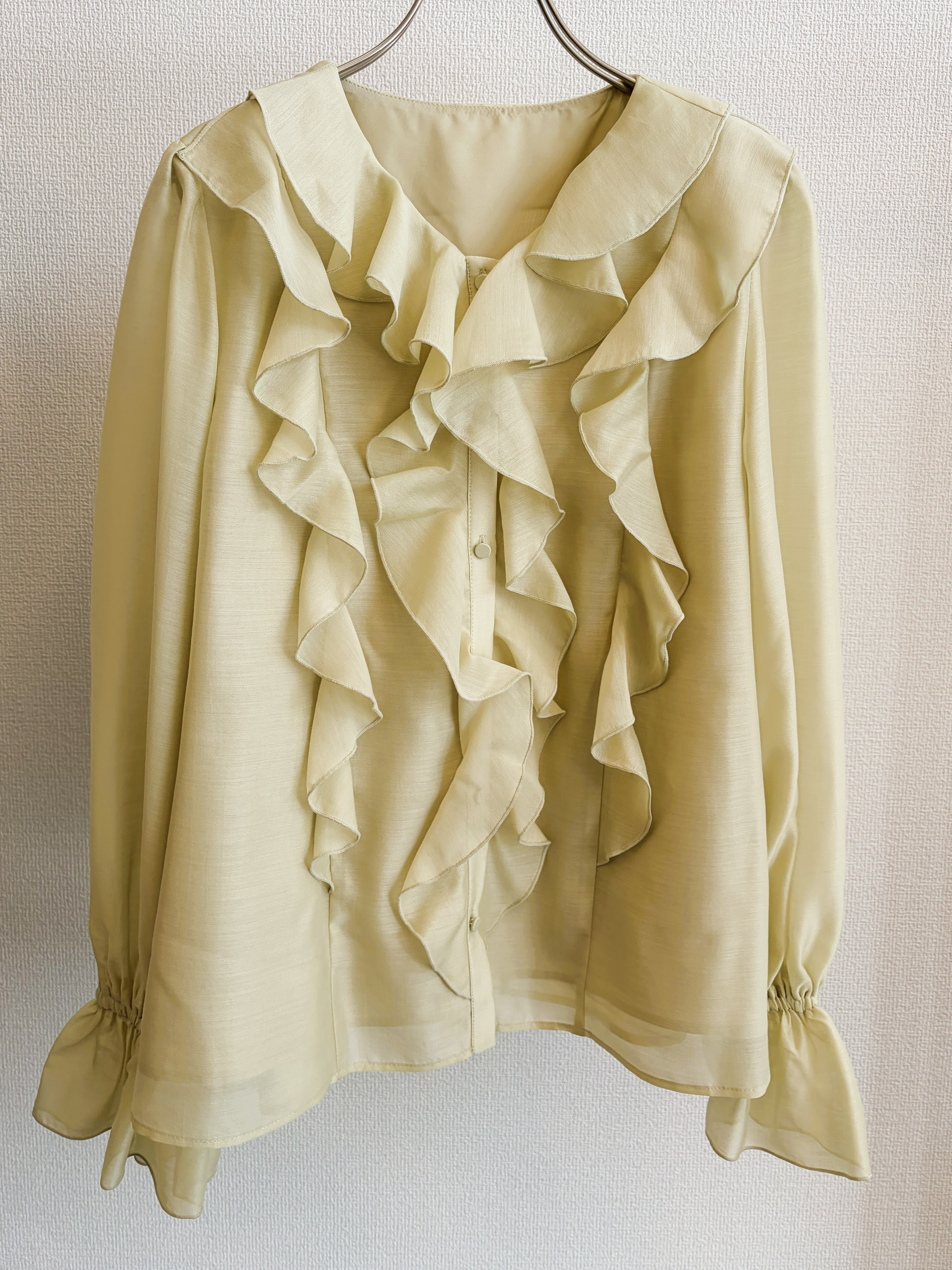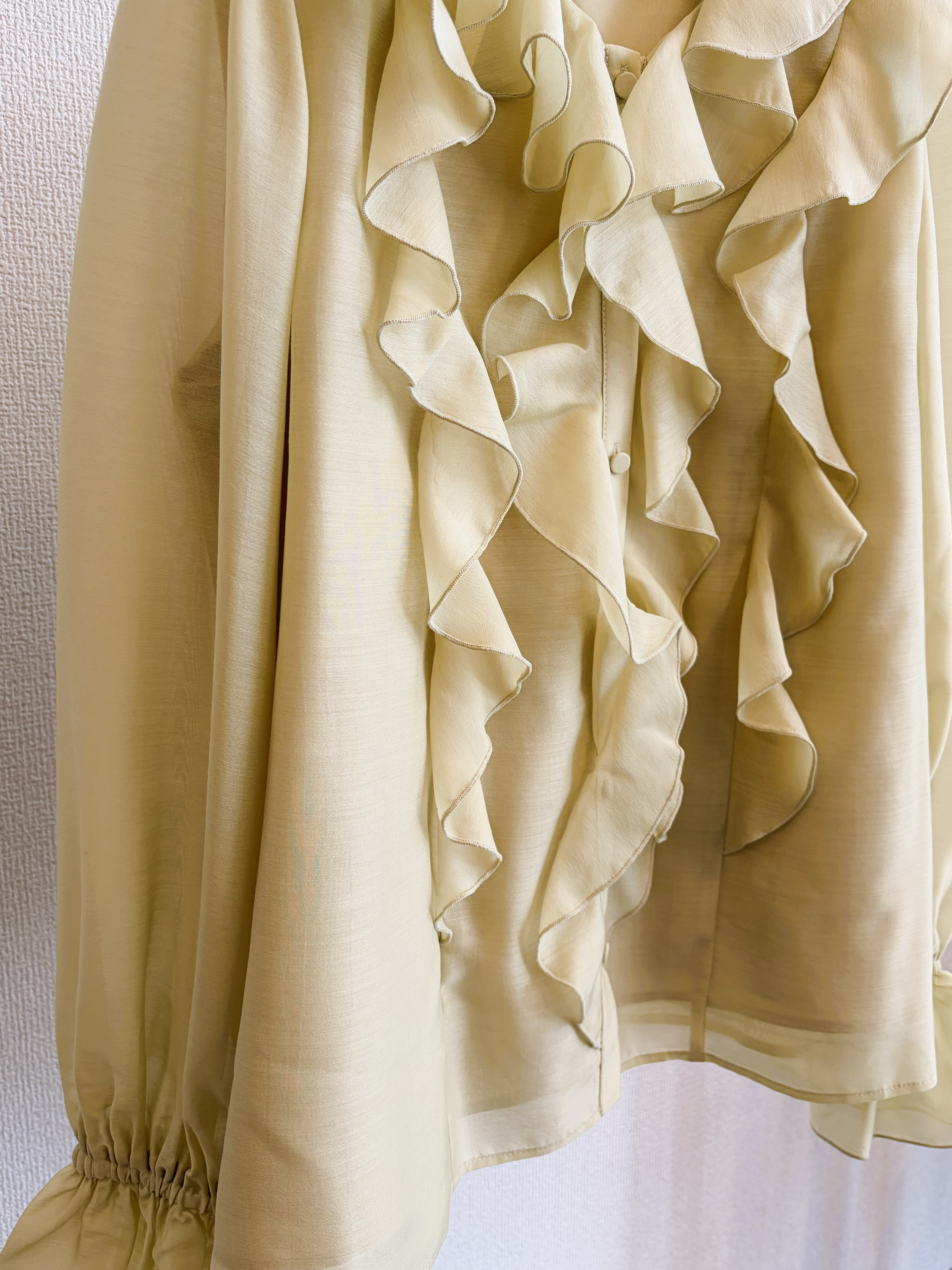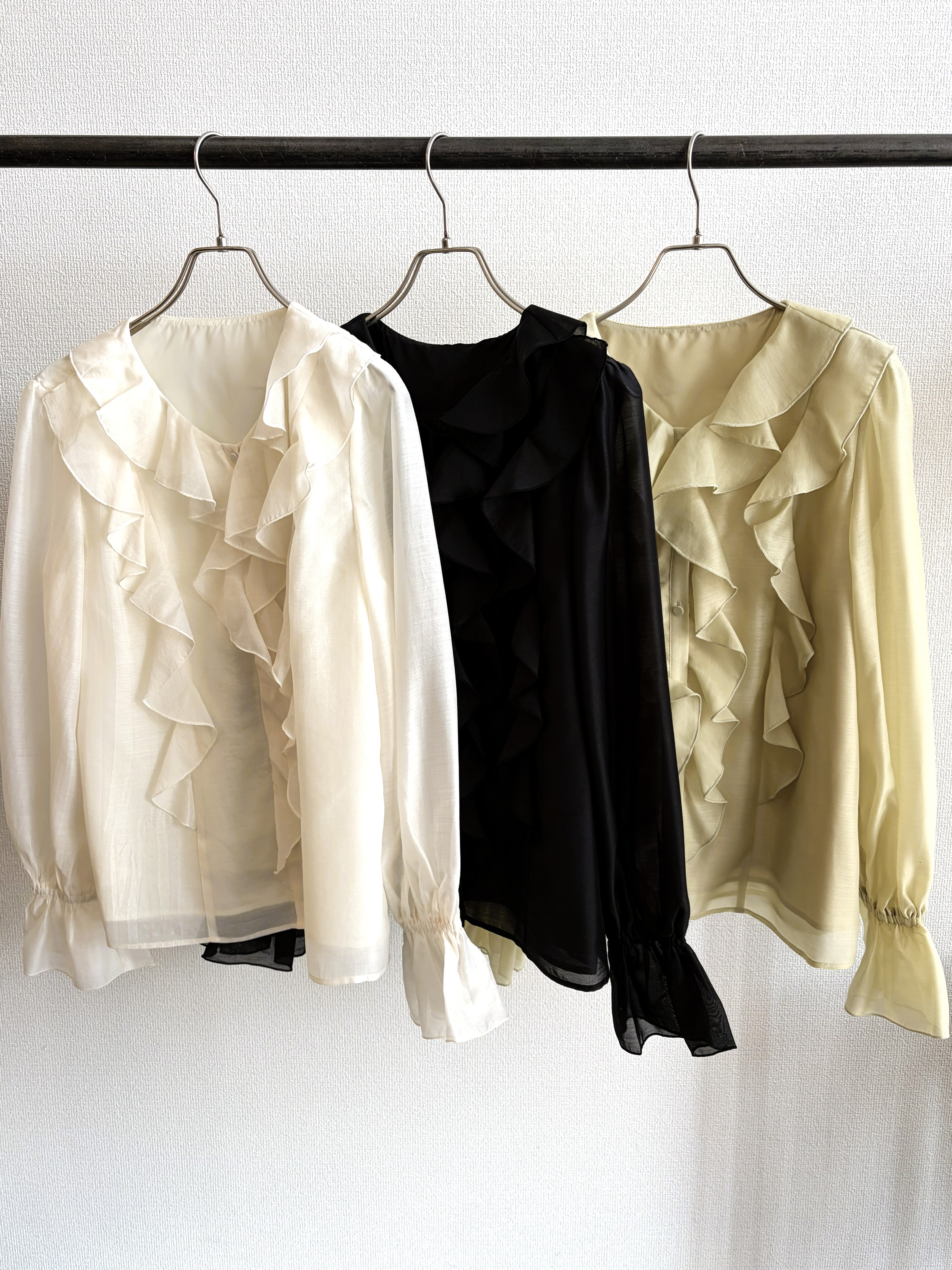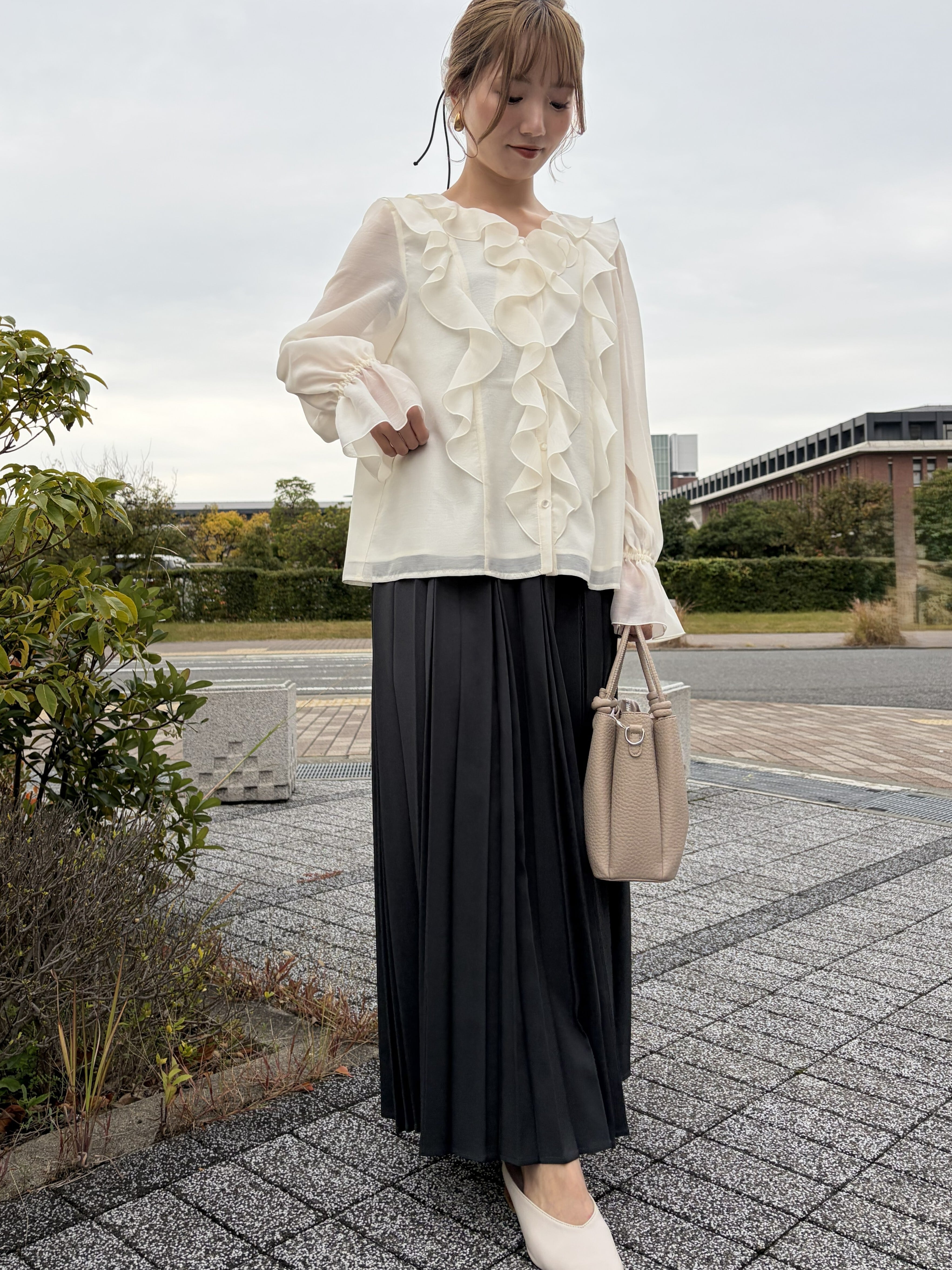 華やかな存在感を演出するシアーラッフルブラウス。