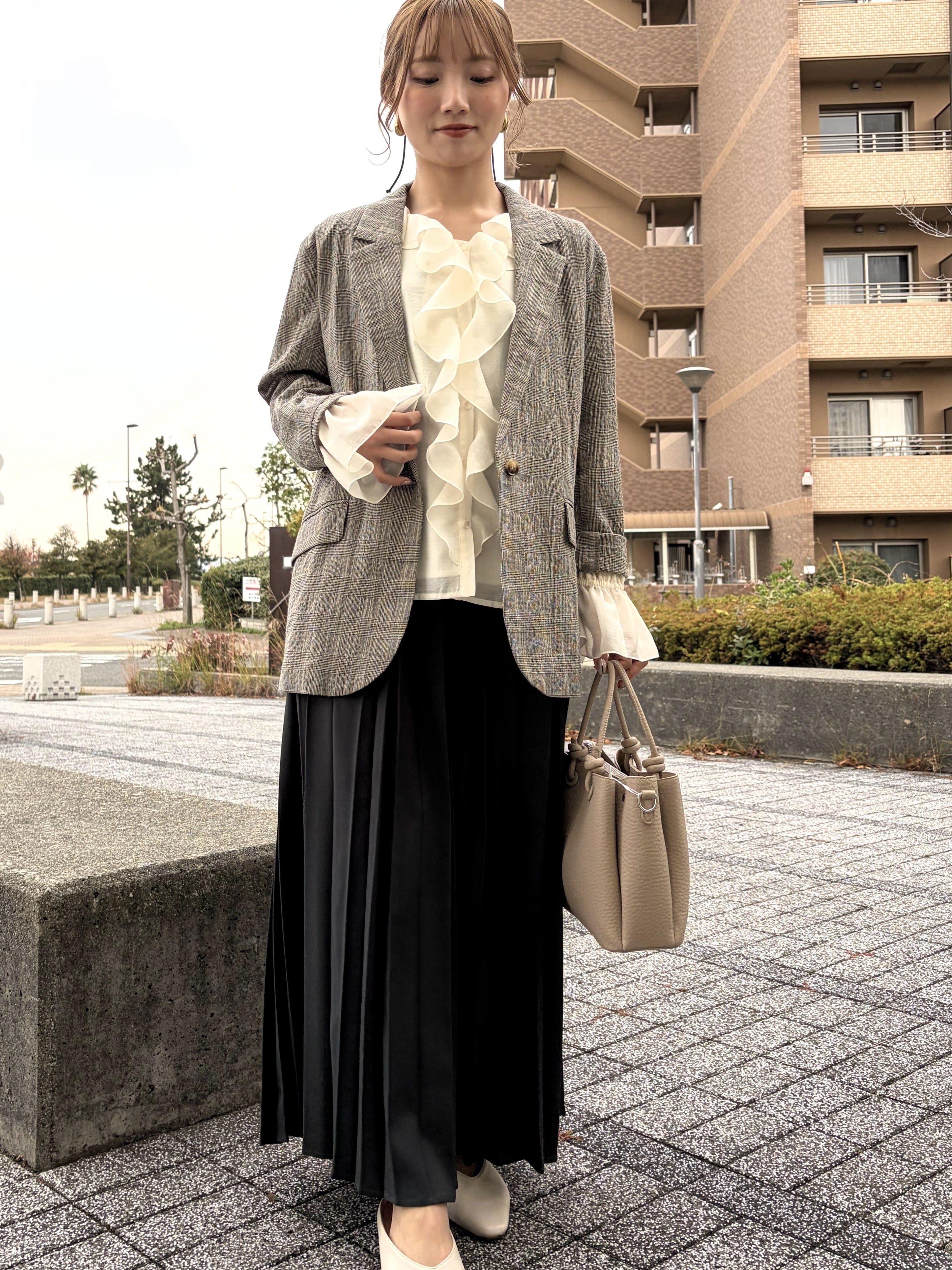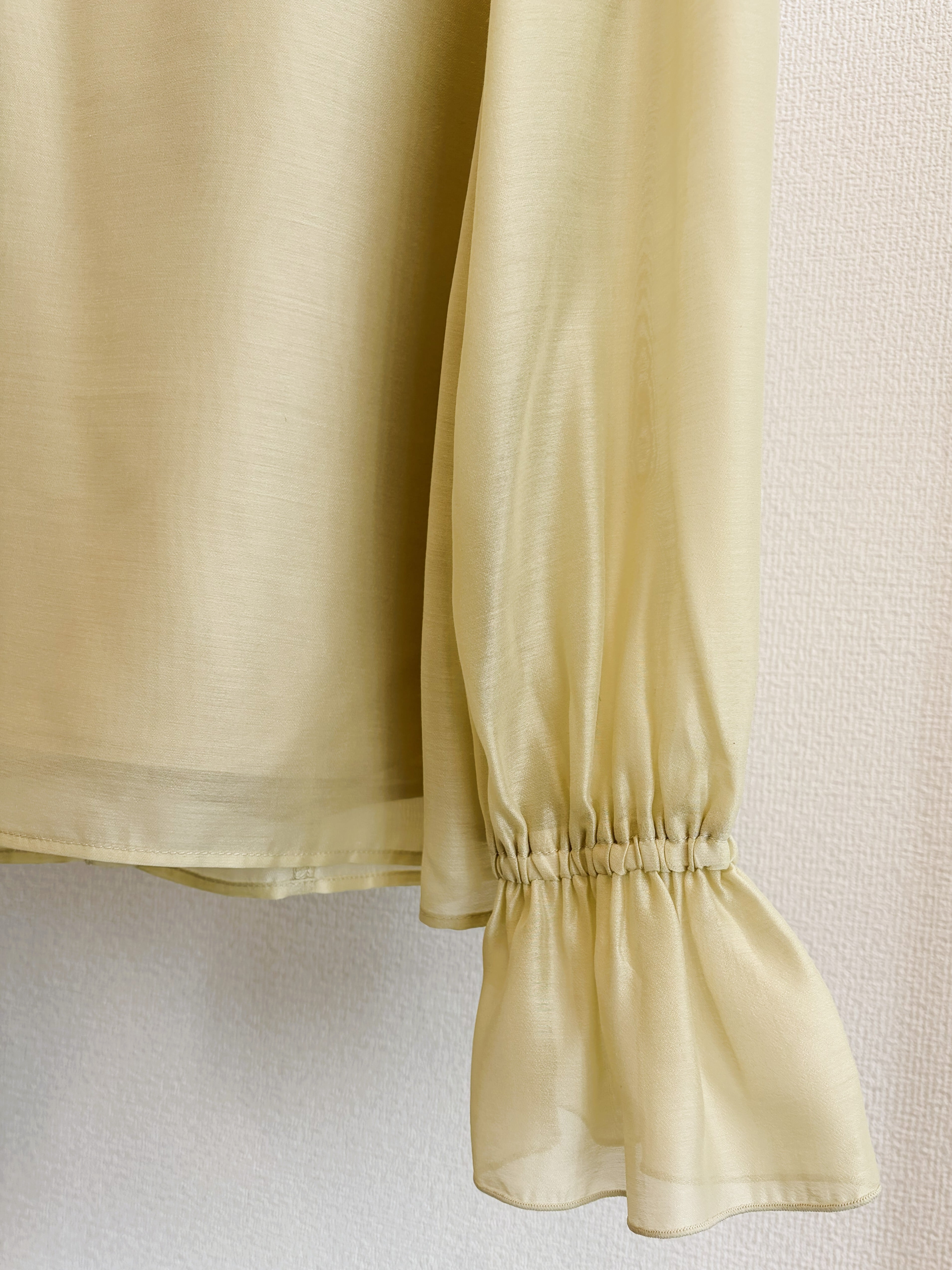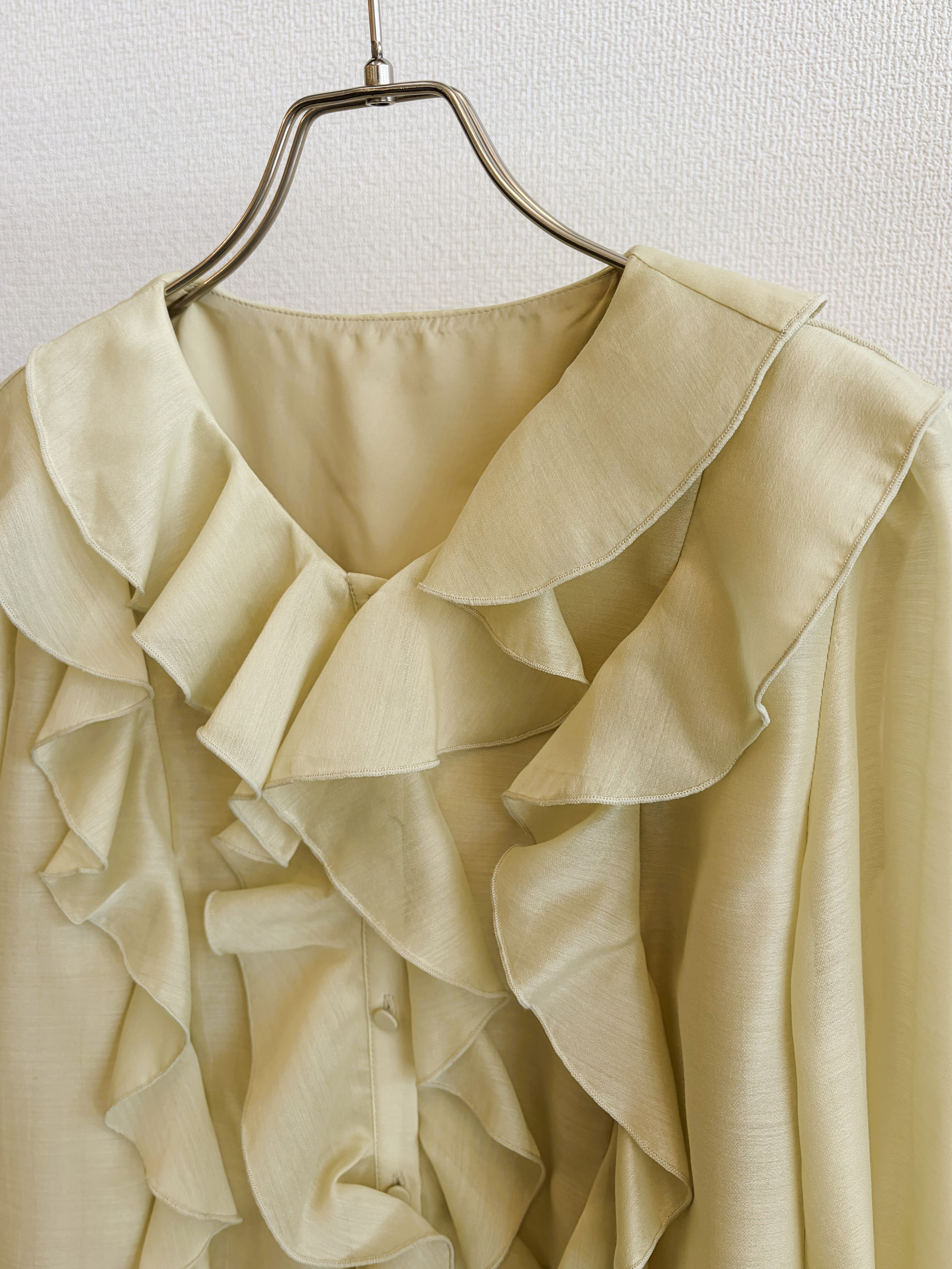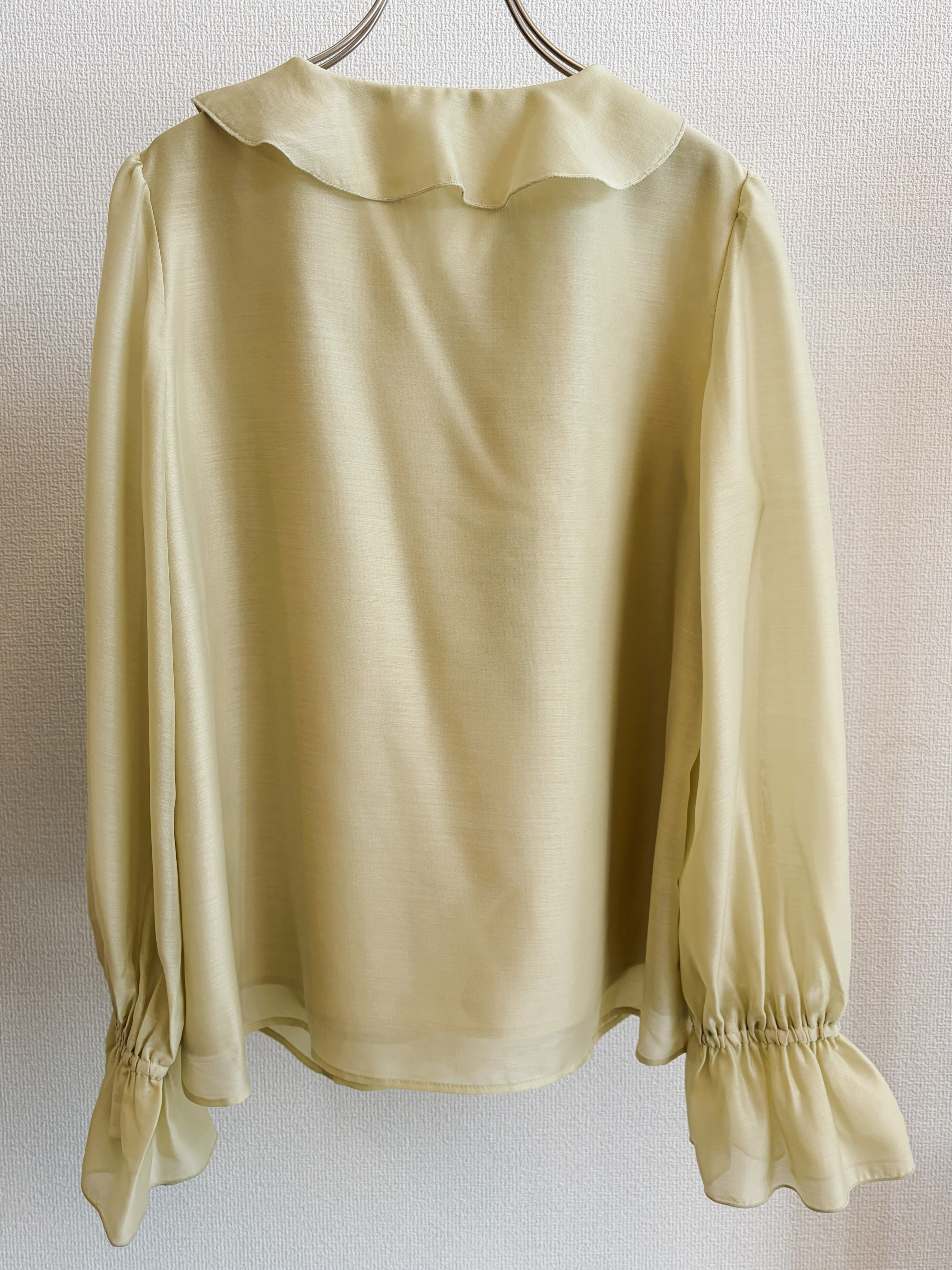 華やかな存在感を演出するシアーラッフルブラウス。
